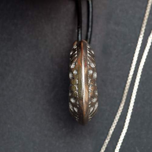 The pendant comes with an ~18-inch black high quality leather cord